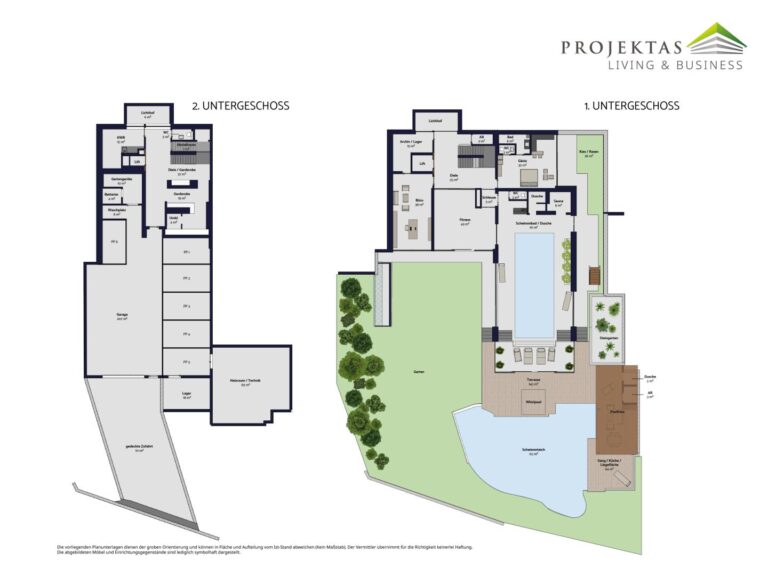 Im Außenbereich setzen ein über 100 m² großer Schwimmteich, eine weitläufige Terrasse mit eingelassenem Whirlpool, großflächige Sonnenschirme und fassadenintegrierte Markisen exklusive Akzente – ein Ambiente, das pure Entspannung verspricht.