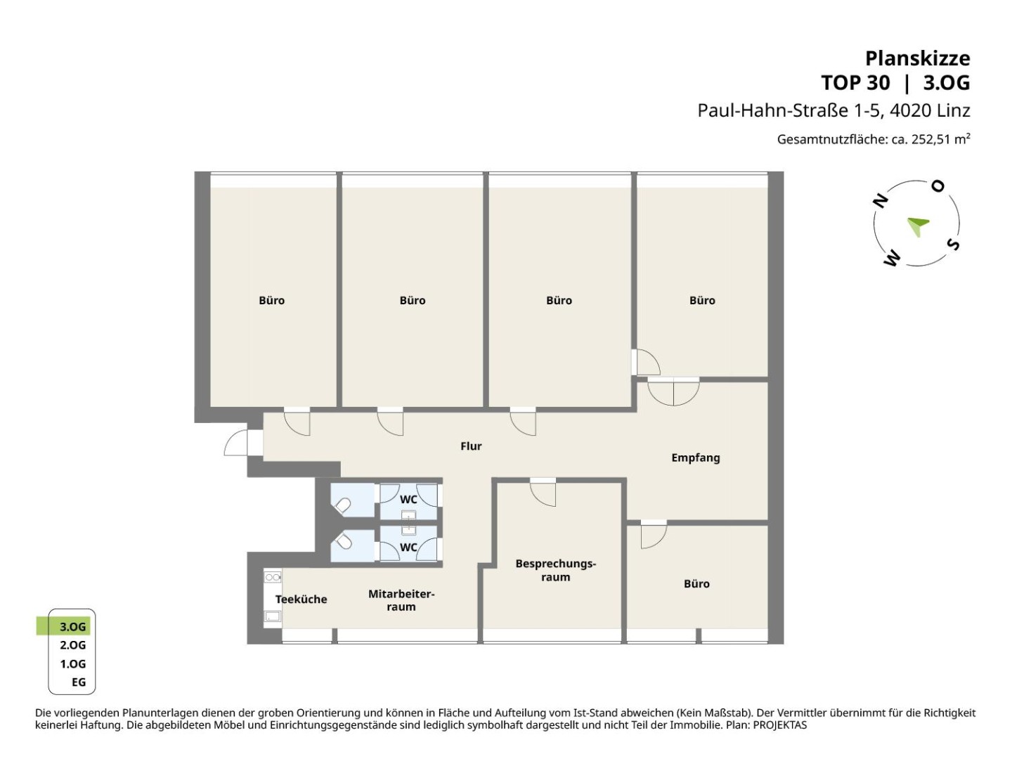Raumaufteilung: Empfang, 3 Seminar-/Büroräume, 2 individuelle Büroräume, Teeküche