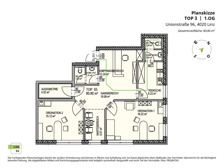 Raumaufteilung: Empfang, Wartebereich, 2 Ordinationsräume, Nebenraum, Teeküche, Sanitär