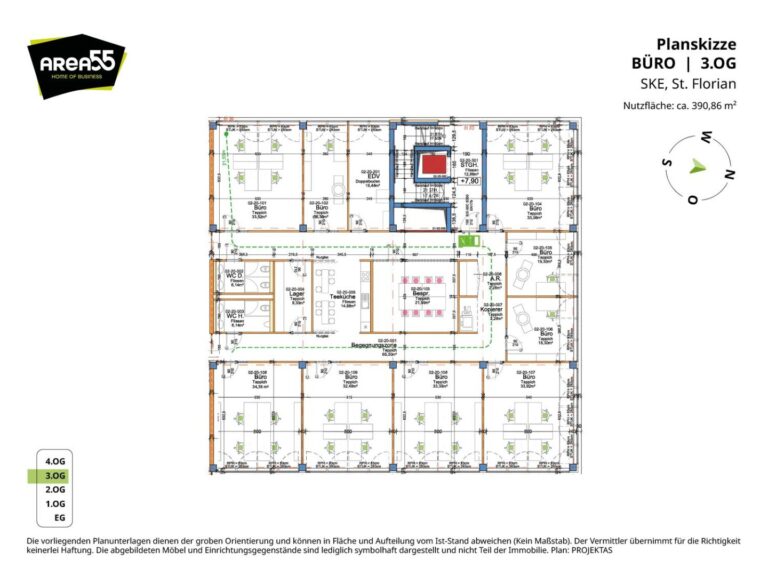 Bürofläche: ca. 390,86 m² je Stockwerk (erweiterbar)