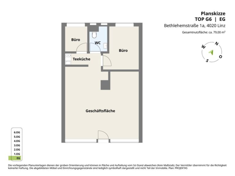 Raumaufteilung: Geschäftsfläche, Büro, Lager, Teeküche, WC