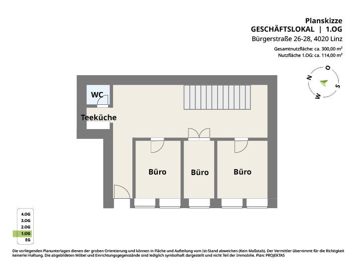 Raumaufteilung: offene Geschäftsfläche, 3 Büroräume, Teeküche, WC