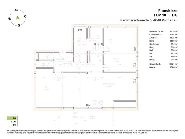 Raumaufteilung der Top 10 mit ca. 116,21 m² Wohnfläche + ca. 16,86 m² Balkon: