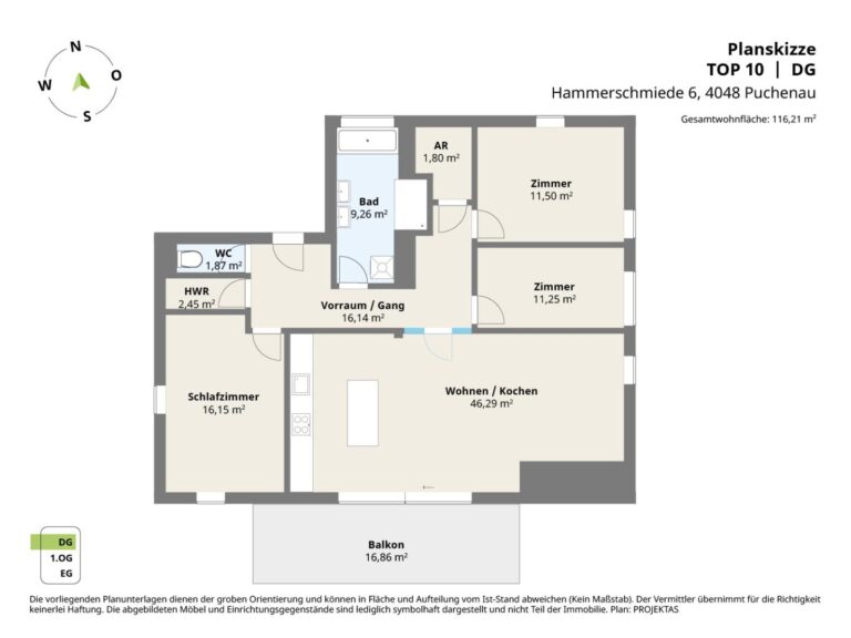 Raumaufteilung der Top 10 mit ca. 116,21 m² Wohnfläche + ca. 16,86 m² Balkon: