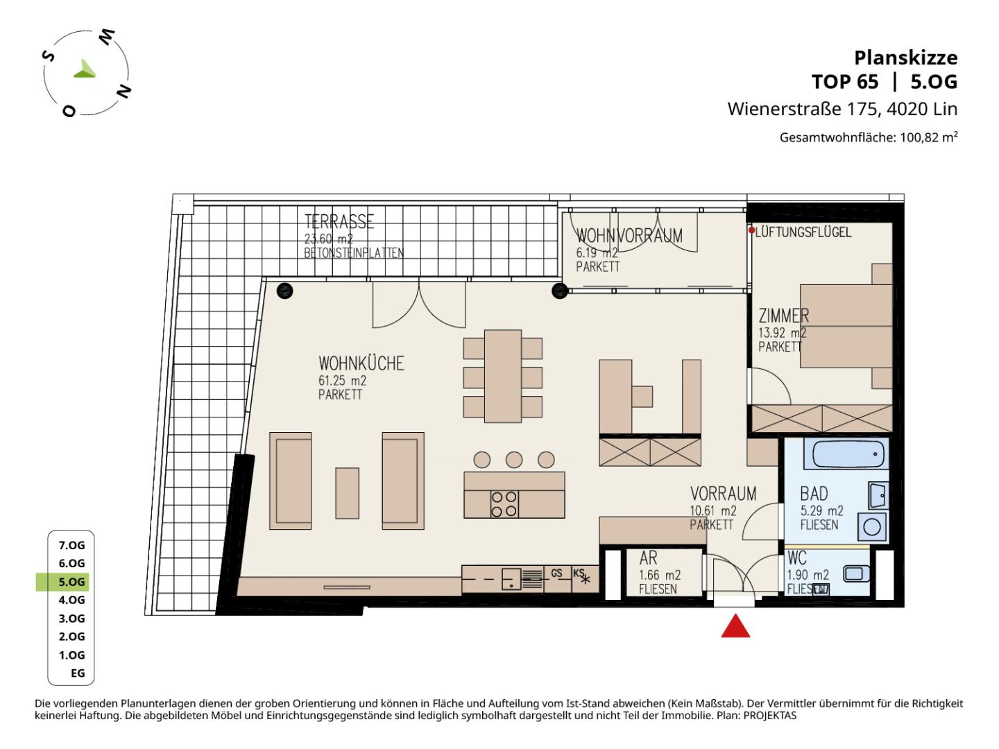 Raumaufteilung Top 52 mit ca. 101 m² Wohnfläche zzgl. ca. 23,60 m² Terrasse im 4. OG:
