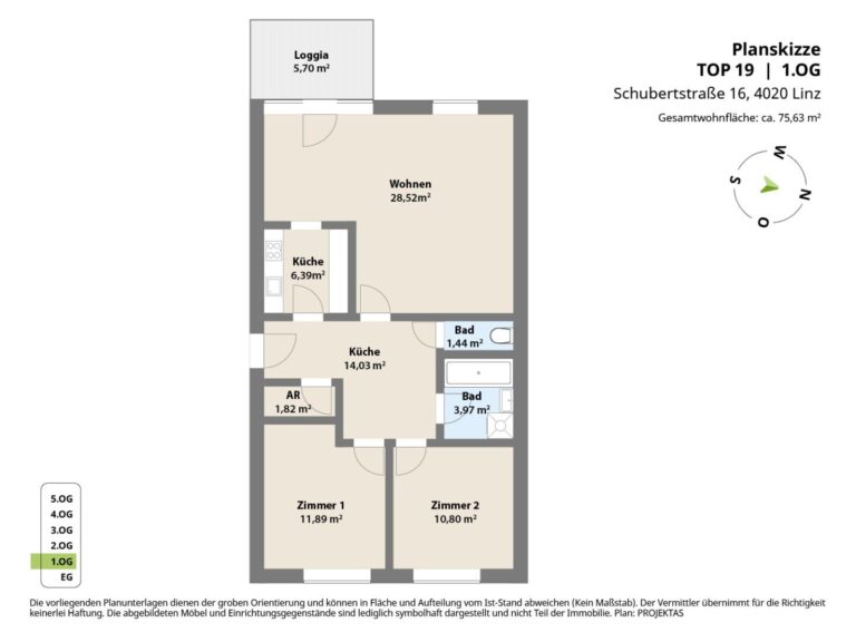Raumaufteilung der Top 19 mit ca. 72,26 m² Wohnfläche zzgl. 5,64 m² Loggia:
