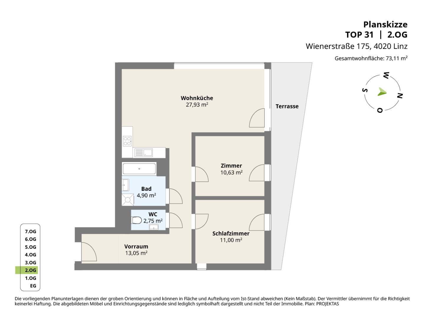 Raumaufteilung Top 31 mit ca. 73,11 m² inkl. 5,69 m² Terrasse im 2. OG: