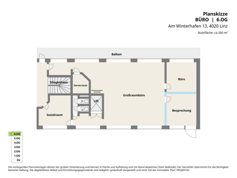 Zum sofortigen Bezug steht diese ca. 250 m² große Bürofläche mit herrlichem Ausblick im 6. OG am Winterhafen 13 zur Verfügung. Die mit Klimaanlage ausgestattete Fläche ist unterteilt in ein Großraumbüro mit Teeküchenanschluß, 1 großzügiges Geschäftsführer Büro und Besprechungsraum. Sozialraum, Serverraum und getrennte Sanitäranlagen sind in der Fläche inkludiert. Für kurze Pausen lädt die vorgelagerte Allgemeinterrasse ein. Weiters besteht die Möglichkeit im Erdgeschoss des Hauses eine großzügige Geschäftsfläche mit Lagermöglichkeiten zusätzlich anzumieten.