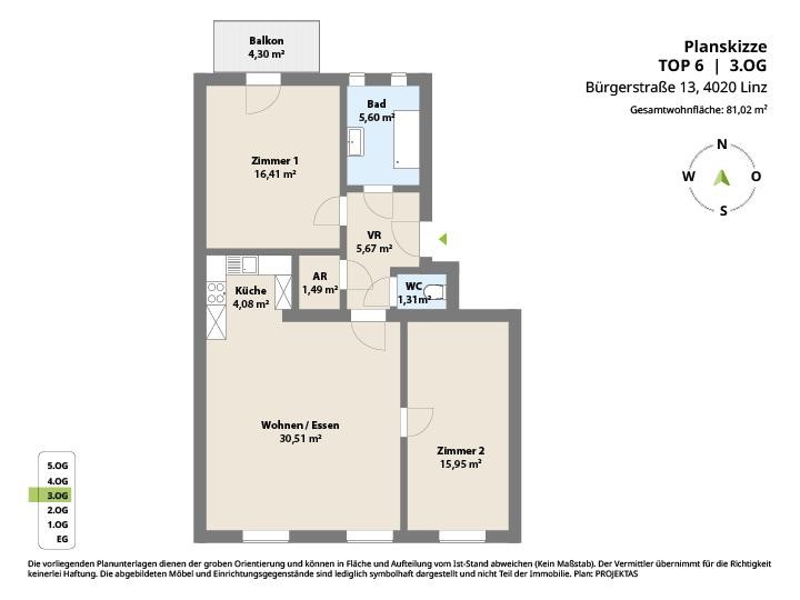 Raumaufteilung der ca. 81 m² im 3. OG (mit Lift):
