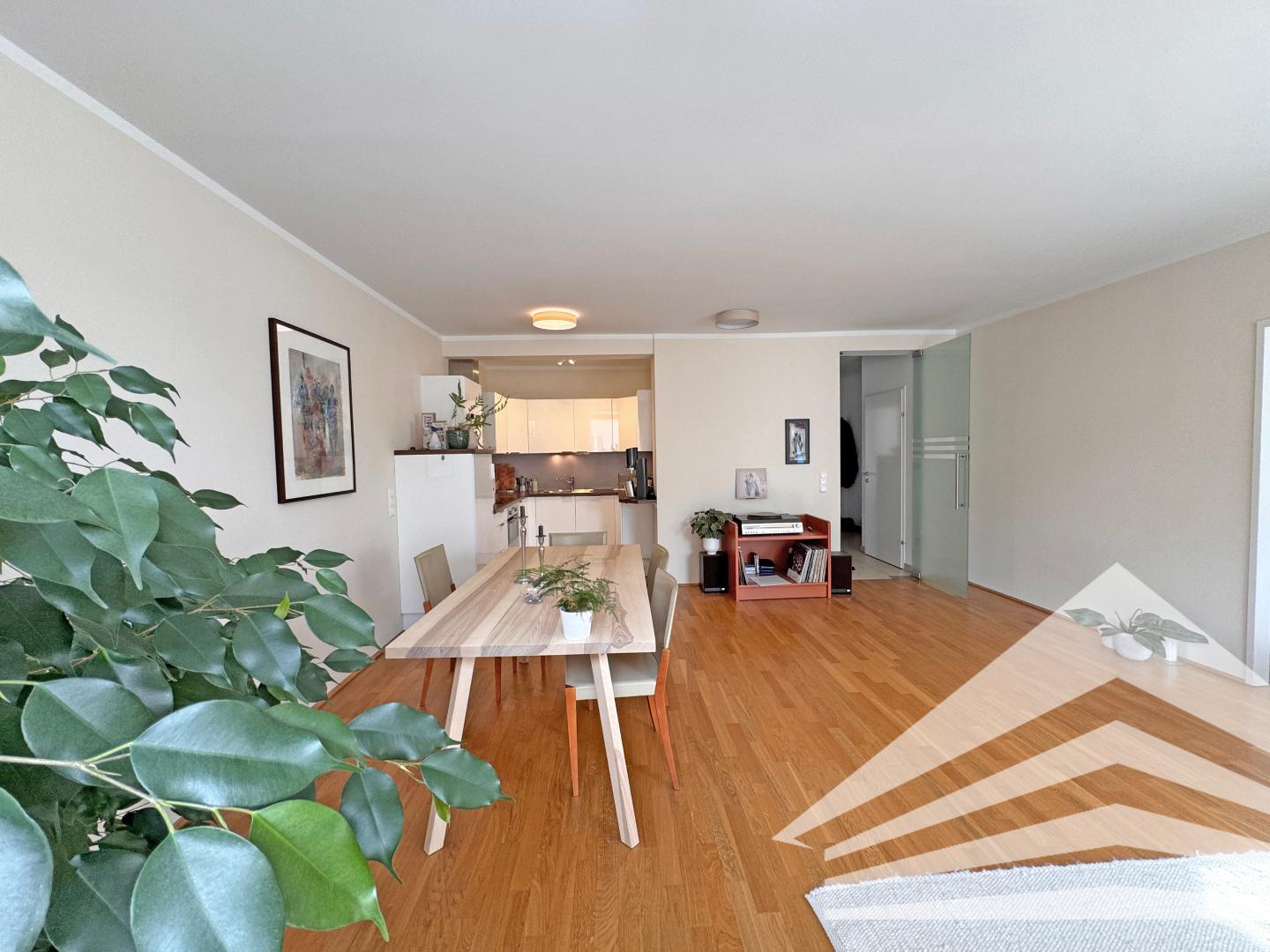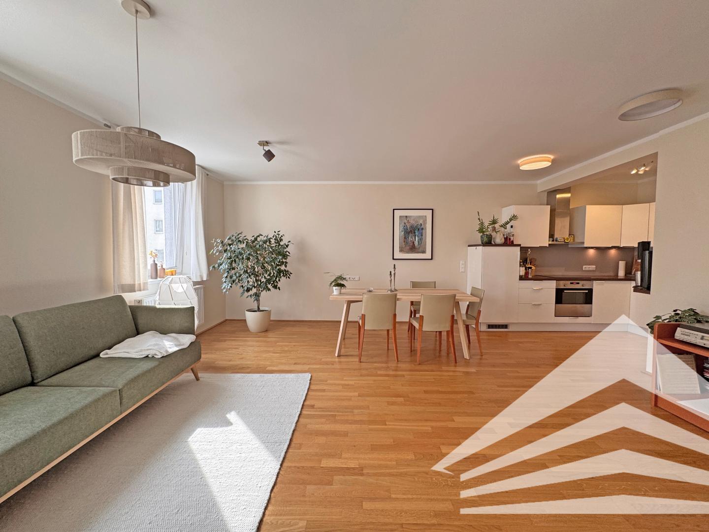 > Großzügiges Wohn- und Esszimmer (Parkett) mit Küche (Küche möbliert & ablösefrei)