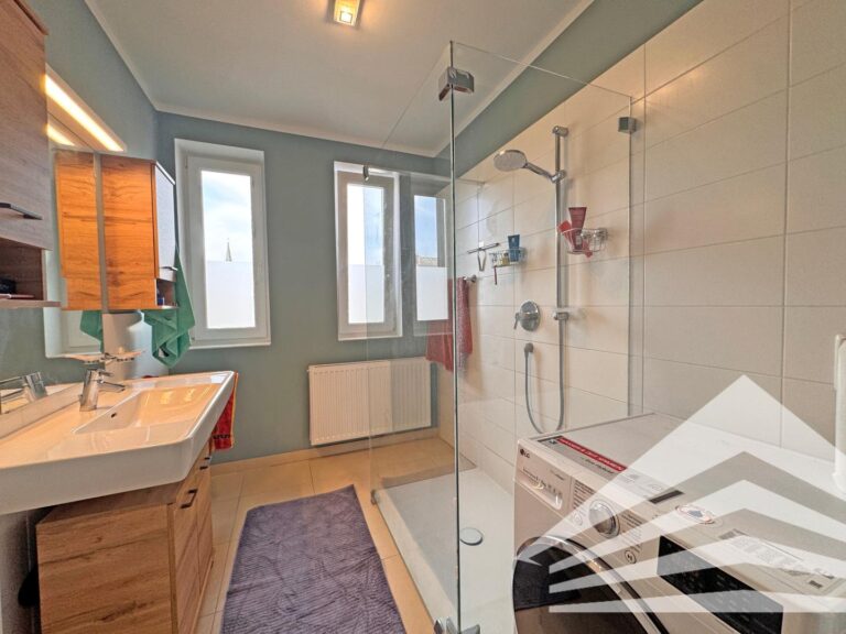 > Tageslicht Bad mit Glasdusche und Waschmaschinenanschluss (Fliese)
