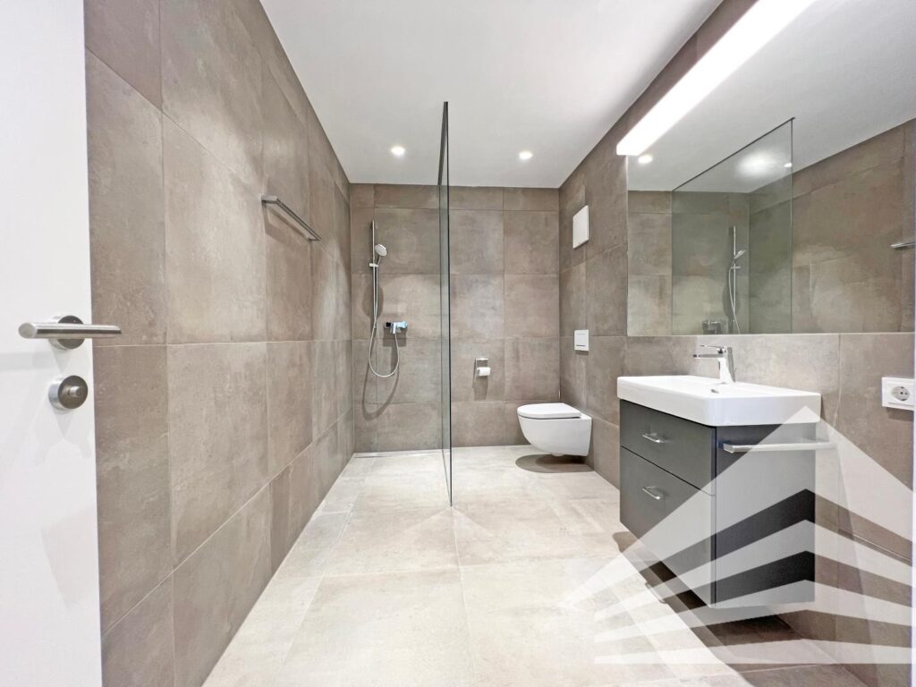 - Design-Badezimmer mit Dusche, WC und Waschmaschinenanschluss