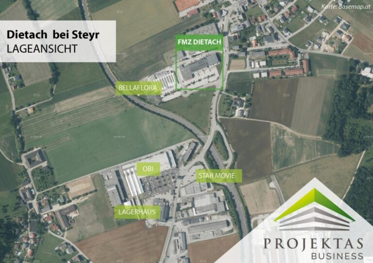 Das Geschäft mit ca. 326 m² Fläche befindet sich im Erdgeschoß des 2007 neu erbauten Fachmarktzentrum in Dietach (Bezirk Steyr-Land) und besticht mit einer XXL-Schaufensterfront und einer überdimensionalen Raumhöhe. Umgeben von namhafter Nachbarschaft (Penny-Markt, Friseur KLIPP, Asia-Restaurant WOK Kaiser, Bellaflora, Garten- und Roboterzubehör IMROTECH) profitiert man zusätzlich von ausreichend Kundenparkplätzen direkt vor dem Geschäft - in Summe stehen 178 Parkplätze für die Kunden des Fachmarktzentrums zur Verfügung.