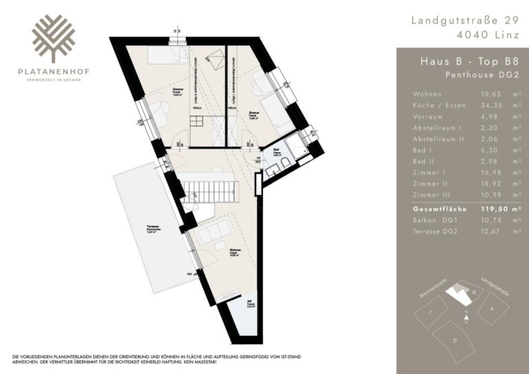 Die wunderschöne Platane ist das grüne Herz im Innenhof der Anlage und sorgt für gutes Klima und wohltuenden Schatten im Sommer. Vom Gartengeschoss bis zu den großzügigen Penthouse-Wohnungen ergeben sich immer wieder tolle Blicke, sowohl auf die Stadt und das Linzer Schloss als auch in den liebevoll angelegten Innenhof und das umliegende Hügelland samt dem Linzer Wahrzeichen "Pöstlingberg".