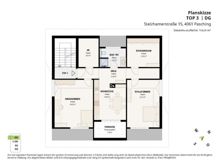 Die Wohnung TOP 3 mit einer Wohnfläche von ca. 108 m² und einer Terrasse von ca. 7,40 m² entstand aufgrund dieses DG-Aufbaus und ist dementsprechend in einem sehr guten, modernen Zustand.