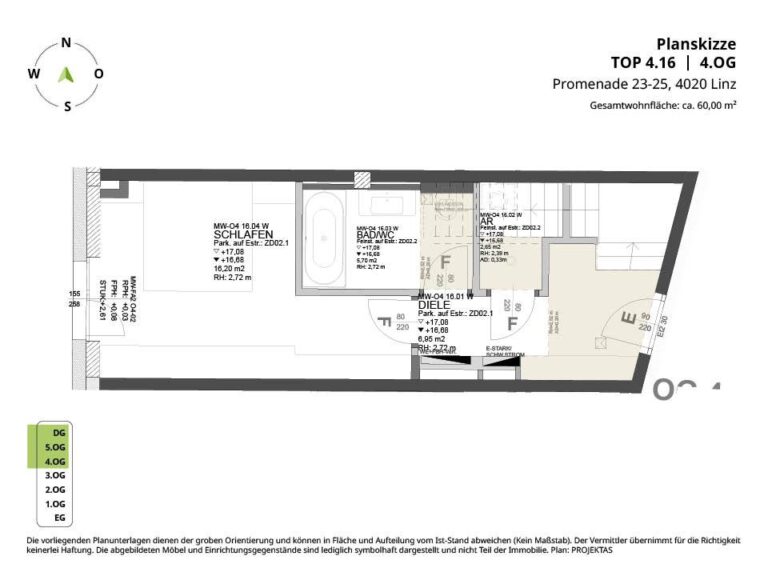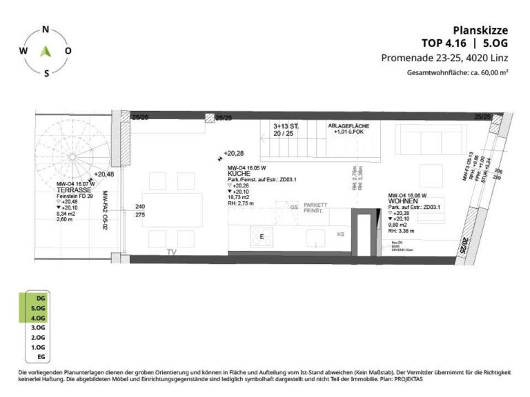 Die TOP 4.16 befindet sich im 4. Obergeschoß und verfügt über eine tolle Dachterrasse im 5. Obergeschoß.