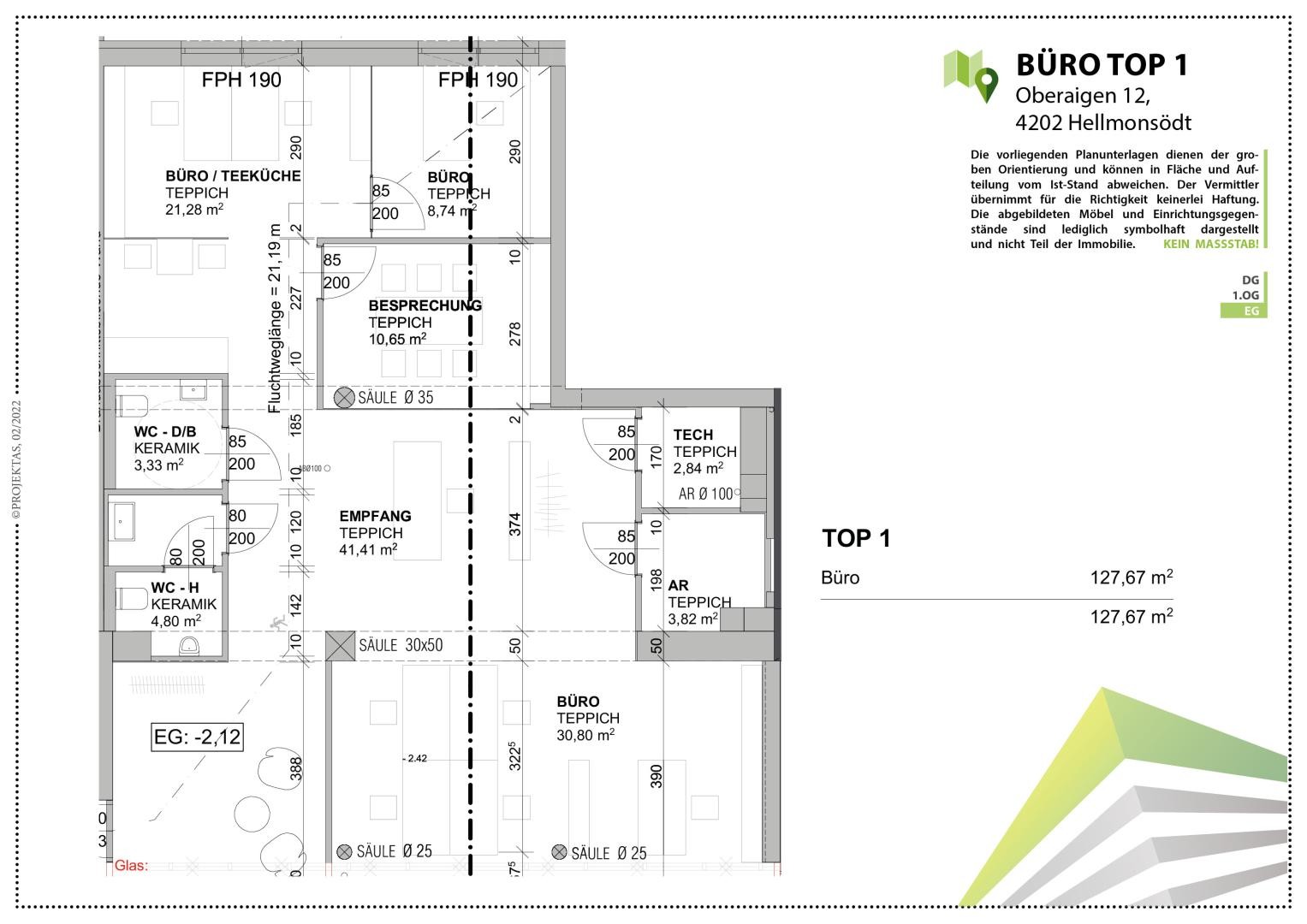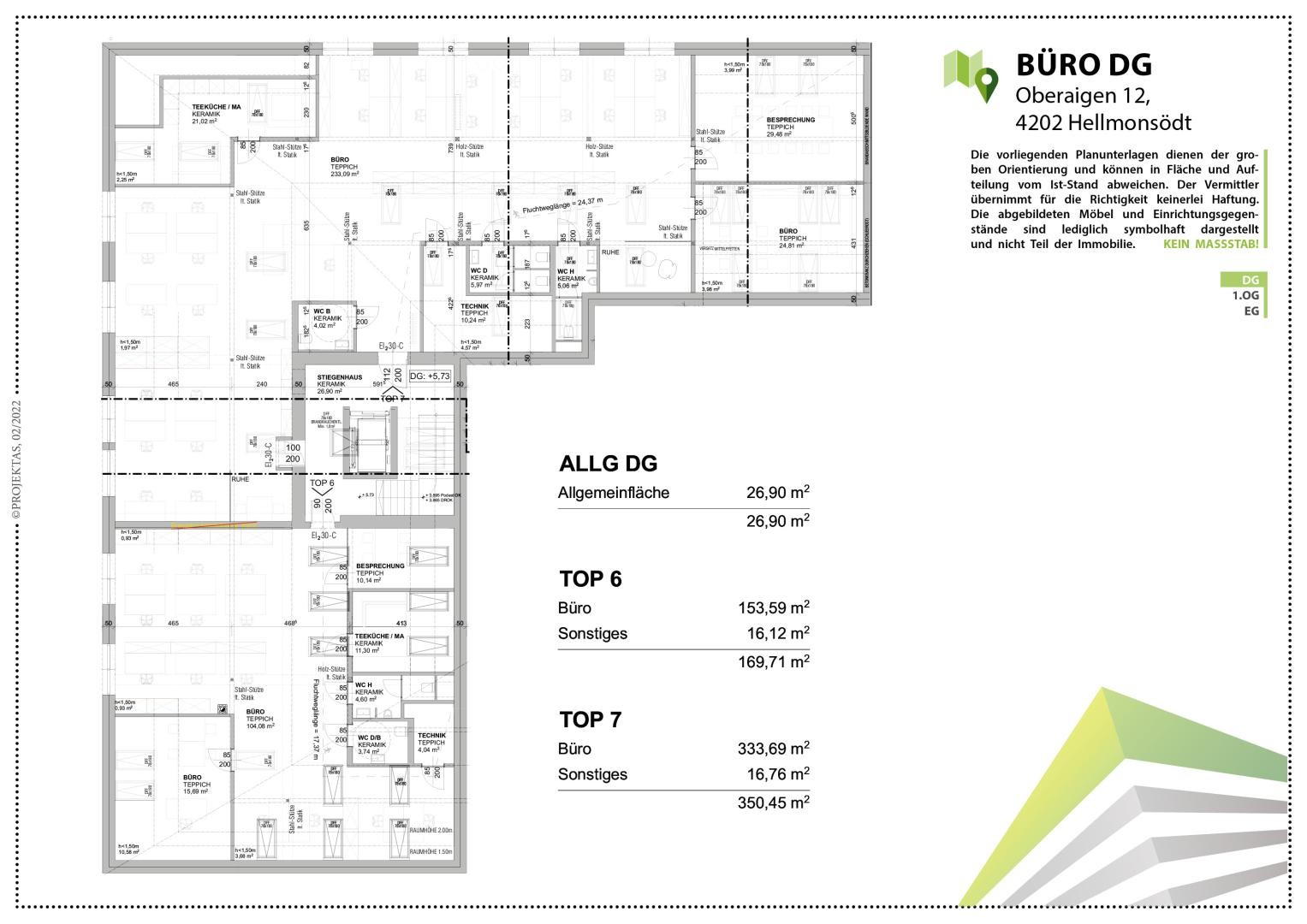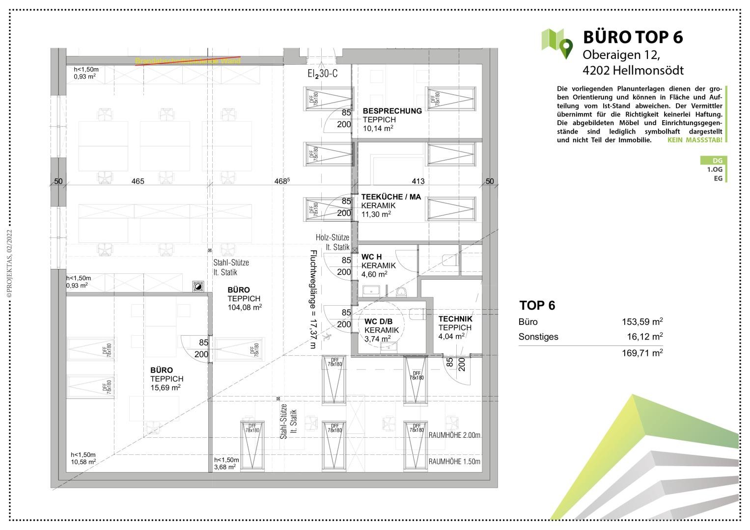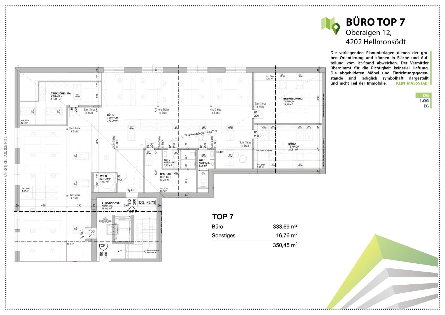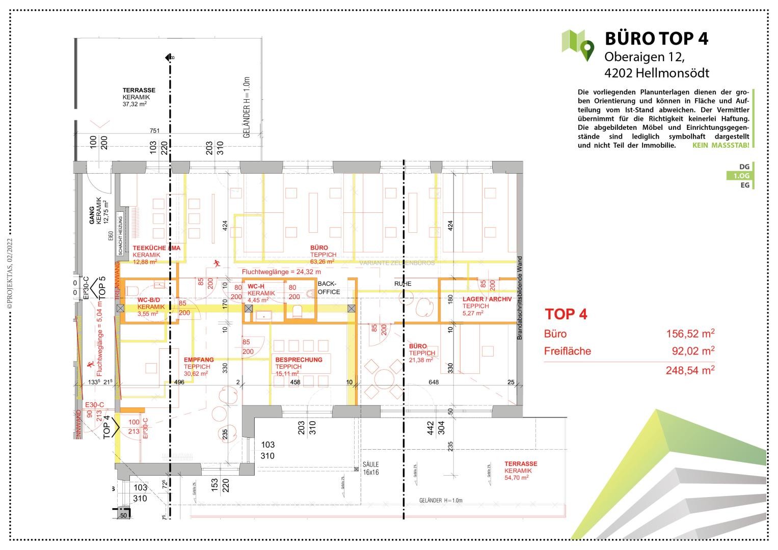 Am Rittsteigerhof in Hellmonsödt wurde ein Zubau errichtet in welchem ab Juni 2022 Praxis- oder Büroflächen von ca. 127,67 m² bis zu ca. 771,47 m² angemietet werden können. Im Innenhof des Neubaues liegt eine attraktive Fläche mit ca. 127,67 m² welche sowohl als Geschäft, Schauraum oder auch Büro genutzt werden kann. Darüberliegend im 1. OG ist eine helle Bürofläche mit ca. 156,52 m² zzgl. einer Terrassenfläche von ca. 92,06 m² angeordnet. Diese beiden Flächen bestechen durch eine Raumhöhe von ca. 3,10m. Das ausgebaute Dachgeschoss mit einer Gesamtfläche von ca. 487,28 m² ist derzeit unterteilt in 2 Büroeinheiten mit ca. 153,59 m² und ca. 333,69 m². Der Innenausbau wird auf den zukünftigen Mieter angepasst und beinhaltet einen belagsfertigen Doppelboden, abgehängte Decken, Trockenbauzwischenwände und Sanitäranlagen. Im Gebäude befindet sich ein Glasfaseranschluß für eine hervorragende Internetverbindung. Selbstverständlich wurde das Gebäude mit einem modernen Personenlift ausgestattet. Die Mietflächen eignen sich sowohl für den konventionellen Bürobetrieb als auch als Praxen im Gesundheitsbereich. Besonders hervorzuheben ist die inspirierende, ruhige Lage des Rittsteigerhofes für Unternehmen die Ihren Mitarbeitern eine gesundes Arbeitsumfeld bieten wollen. Wandern oder Radfahren im Sommer und Langlaufen im Winter in der direkt angrenzenden Nordic Arena bieten Mitarbeiten sportlichen Ausgleich zum Büroalltag. Ausreichend Parkplätze in der Garage sowie Freistellplätze sind direkt am Objekt verfügbar.