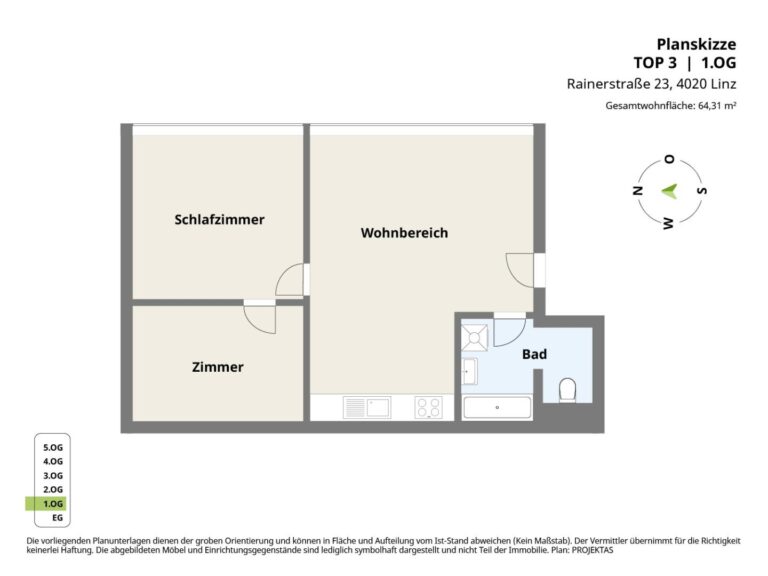 Raumaufteilung der Top 3 mit ca. 64,31 m² Wohnfläche: