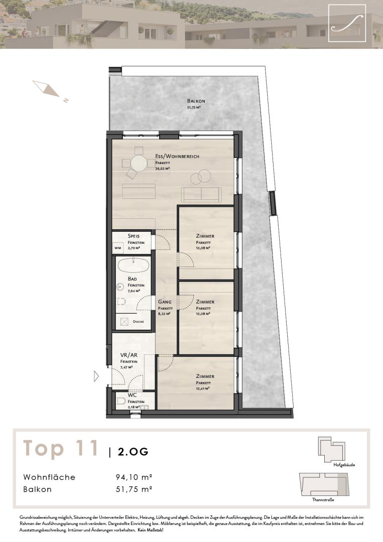 Raumaufteilung der Top 11 mit ca. 94,10 m² Wohnfläche zzgl. 51,75 m² Balkon: