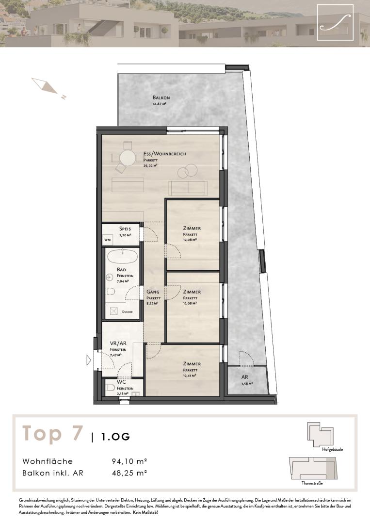 Raumaufteilung der Top 7 mit ca. 94,10 m² Wohnfläche zzgl. 48,25 m² Balkon:
