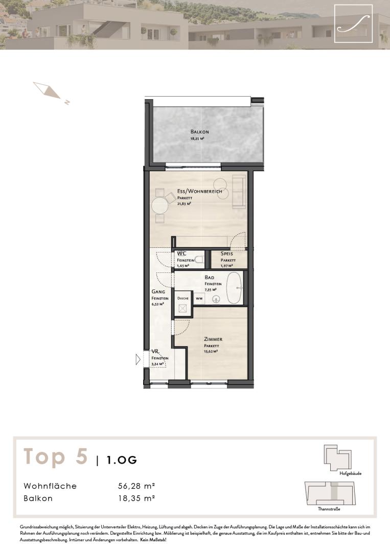 Raumaufteilung der Top 6 mit ca. 56,28 m² Wohnfläche zzgl. 18,35 m² Balkon: