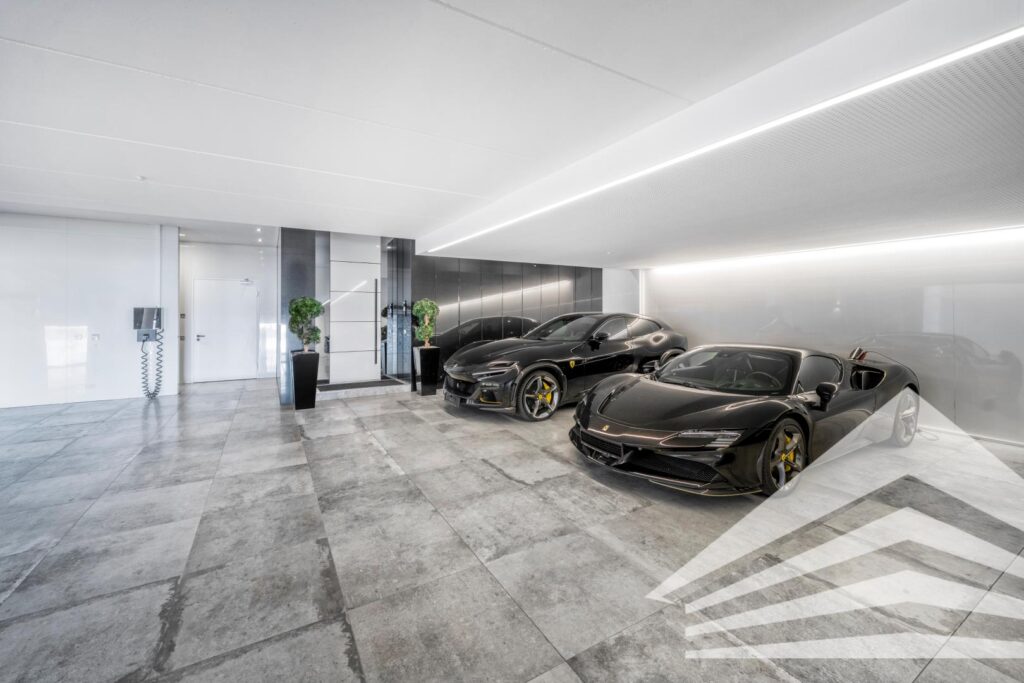 Die Villa begeistert durch klare Linien, großzügige Glasflächen und eine beeindruckende Transparenz, die Innen- und Außenräume nahtlos miteinander verschmelzen lässt. Eine beeindruckende Garage mit überdachter Zufahrt bietet Platz für bis zu sechs Fahrzeuge und ist selbstverständlich mit einer E-Ladestation ausgestattet.