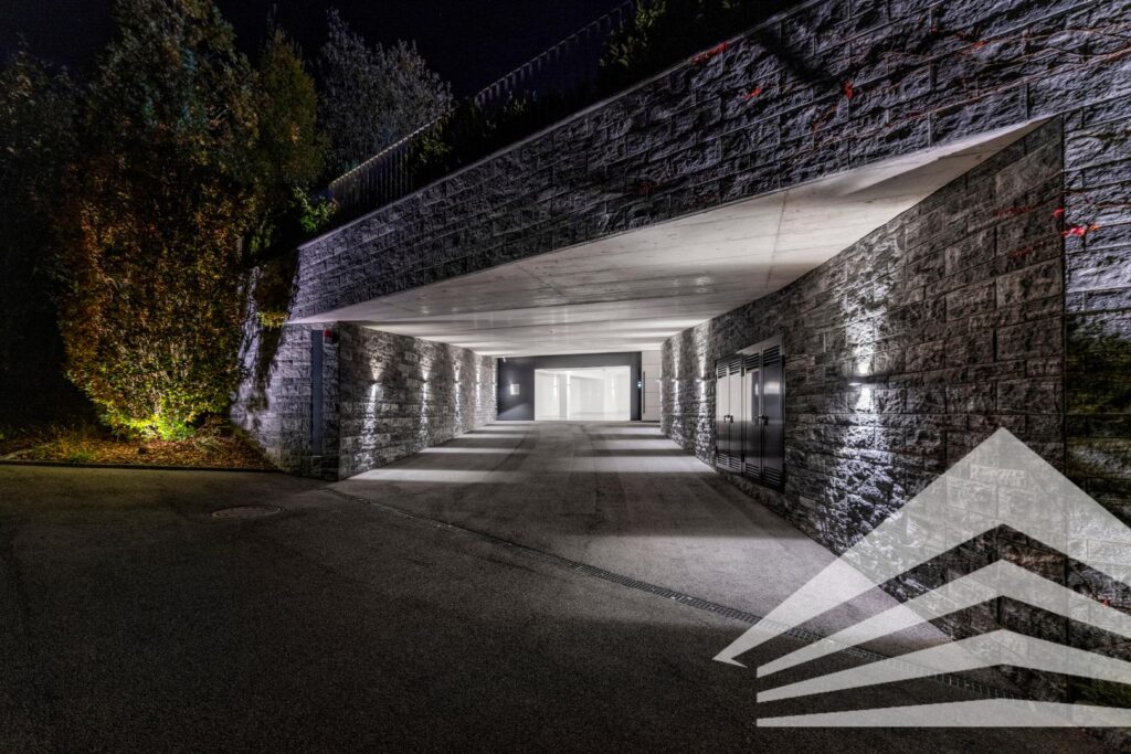 Für Sicherheit und Komfort stehen die vollautomatische Loxone-Steuerung mit AMX-System, eine Alarmanlage mit Kameras, eine Wohnraumlüftung sowie eine separate Lüftungsanlage für den Wellnessbereich.