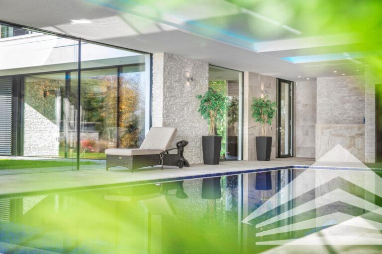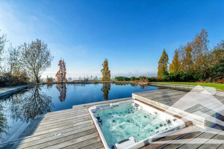 Im Außenbereich setzen ein über 100 m² großer Schwimmteich, eine weitläufige Terrasse mit eingelassenem Whirlpool, großflächige Sonnenschirme und fassadenintegrierte Markisen exklusive Akzente – ein Ambiente, das pure Entspannung verspricht.