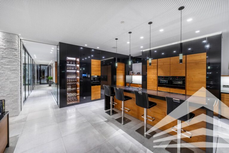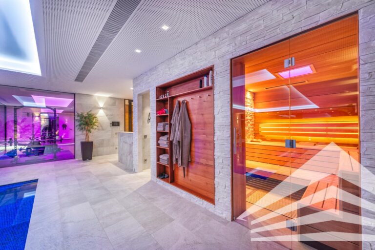 Auch in praktischen Details zeigt sich der Anspruch dieser Immobilie: Ein eigener Hundewaschplatz, ein Bereich für Fahrradreinigung sowie nützliche Lagerräume ergänzen das Angebot. Im Inneren dominieren edle Materialien und stilvolle Designlösungen. Ein doppelseitiger Kamin mit Holz- und Ethanolfeuer sorgt für eine besondere Atmosphäre, während hochwertige Molto-Luce-Leuchten und eine Infrarotkabine im Masterbad den luxuriösen Wohnkomfort abrunden.