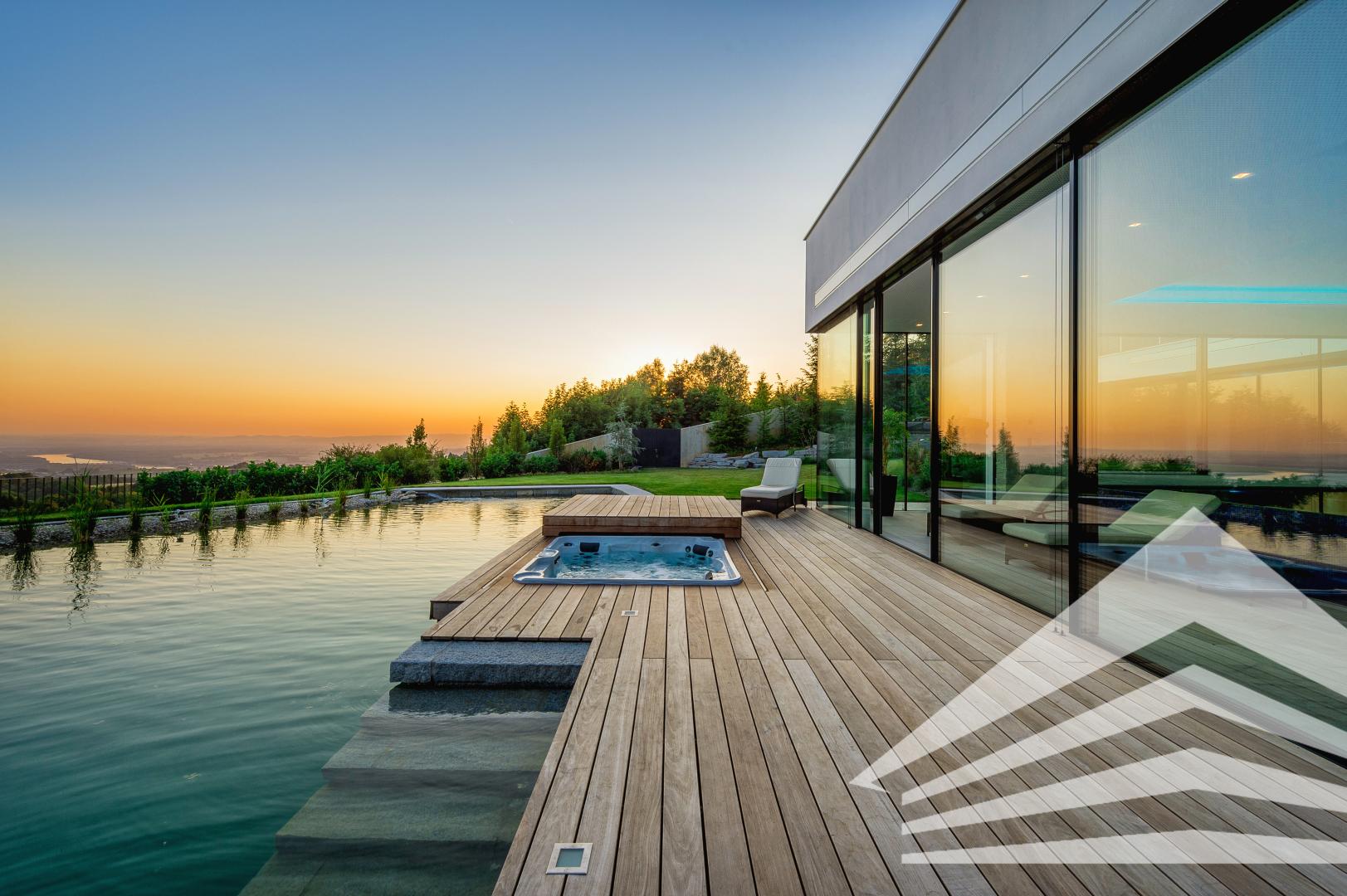 Im Außenbereich setzen ein über 100 m² großer Schwimmteich, eine weitläufige Terrasse mit eingelassenem Whirlpool, großflächige Sonnenschirme und fassadenintegrierte Markisen exklusive Akzente – ein Ambiente, das pure Entspannung verspricht.