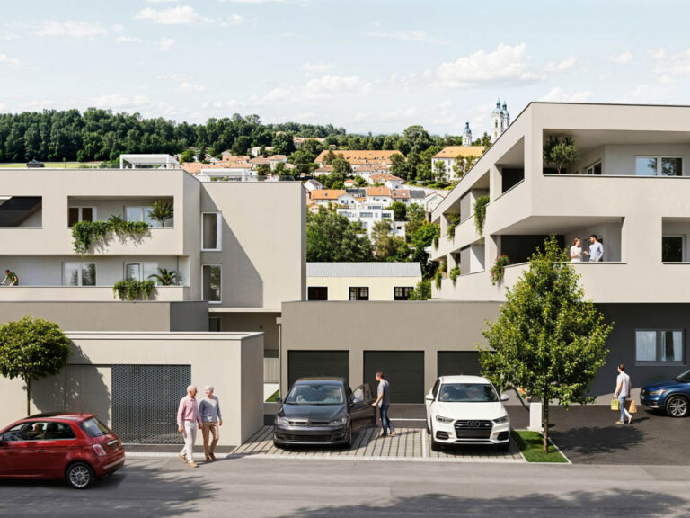 Die Stiftslichtung St. Florian vereint moderne Architektur mit einem klar strukturierten Wohnkonzept. Zwei Baukörper formen das Projekt: das straßenseitige Hauptgebäude an der Thannstraße mit neun Wohnungen sowie das nach innen orientierte Hofgebäude mit sechs weiteren Einheiten.