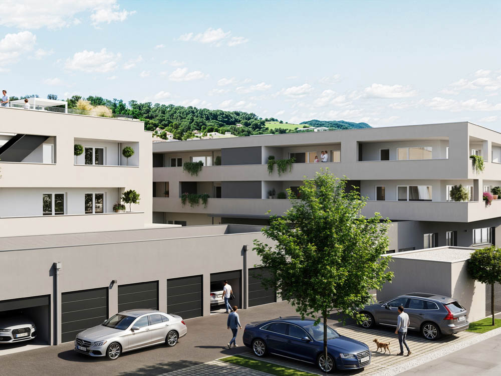 Für Mobilität und Stauraum ist bestens gesorgt: Außenstellplätze sowie Garagen mit Abstellräumen (als Kellerersatz) stehen zur Verfügung – inkl. Vorbereitung für E-Ladestationen.