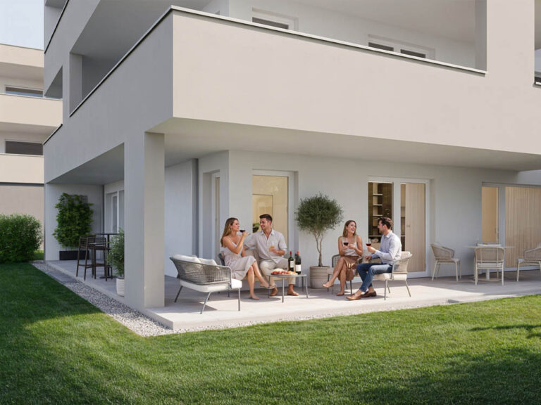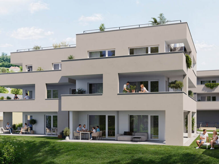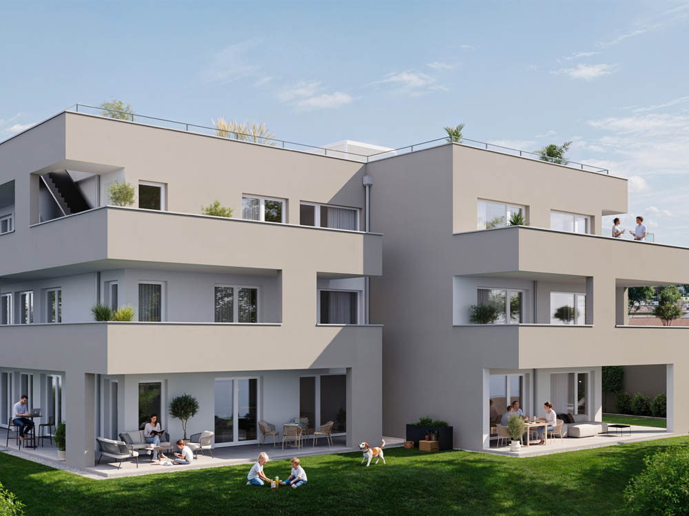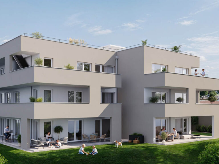 Die Erdgeschosswohnungen verfügen zusätzlich über eingezäunte Privatgärten, während die Obergeschoßwohnungen mit großzügigen Außenflächen punkten.