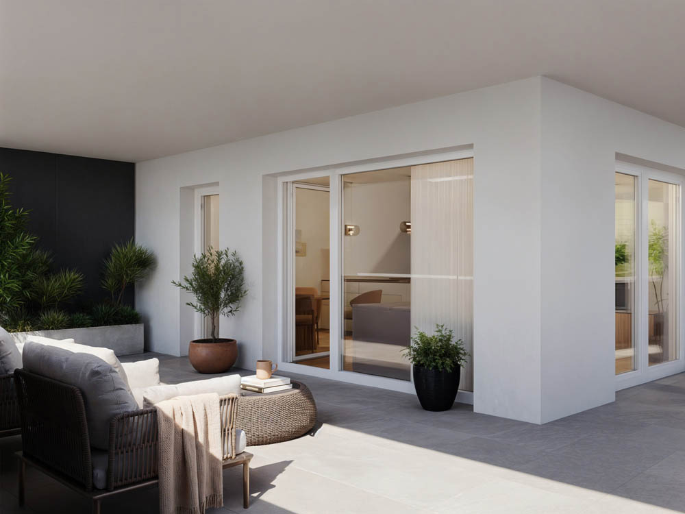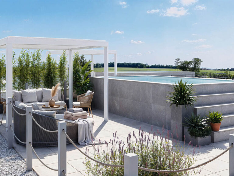 Die Penthouse-Dachterrassen mit Pergola bieten vielfältige Möglichkeiten der Gestaltung und – falls gewünscht – Platz für einen Dachpool, der ein außergewöhnliches Wohn-Highlight darstellen kann.