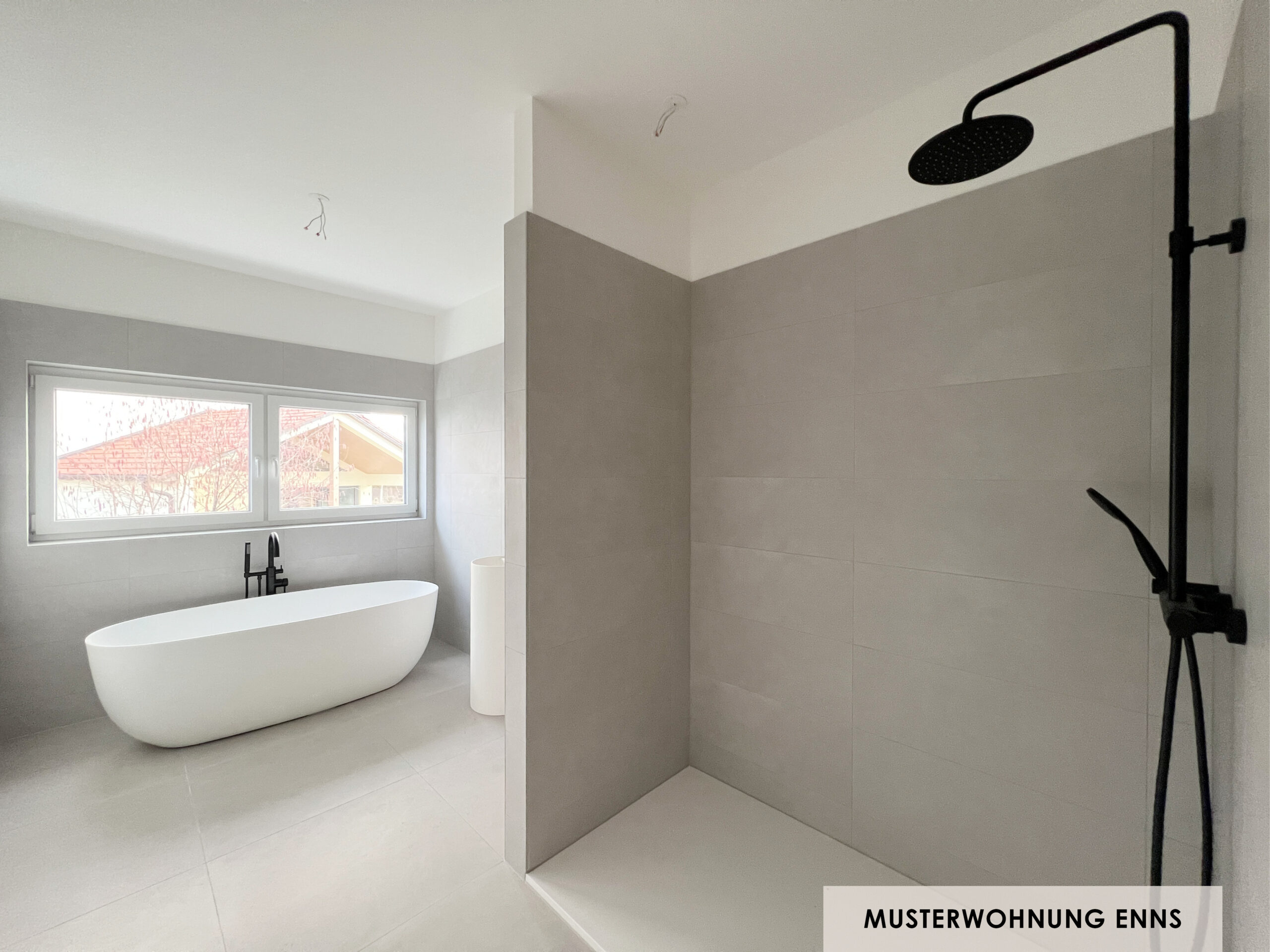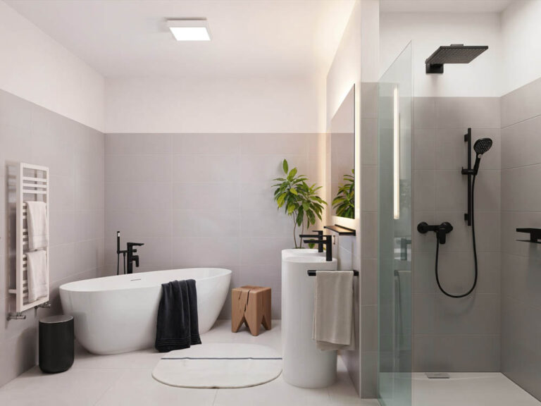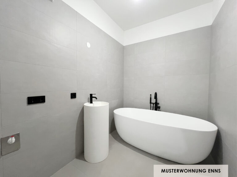 Die Sanitärausstattung zeichnet sich durch hochwertige Armaturen, elegante Badewannen und formschöne Waschtische aus, die den Räumen ein ruhiges, ästhetisches Gesamtbild verleihen.